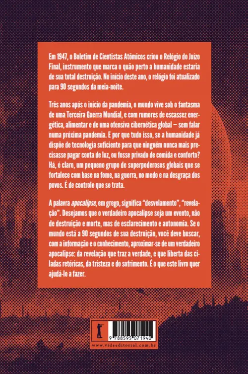 A palavra apocalipse, em grego, significa “desvelamento”, “revelação”. Desejamos que o verdadeiro apocalipse seja um evento, não de destruição e morte, mas de esclarecimento e autonomia. Se o mundo está a 90 segundos de sua destruição, você deve buscar, com a informação e o conhecimento, aproximar-se de um verdadeiro apocalipse: da revelação que traz a verdade, e que liberta das ciladas retóricas, da tristeza e do sofrimento. É o que este livro quer ajudá-lo a fazer.