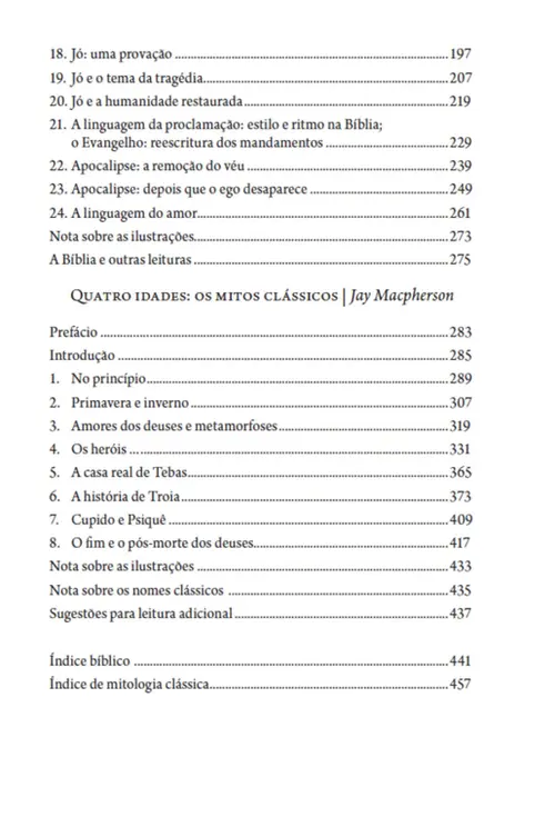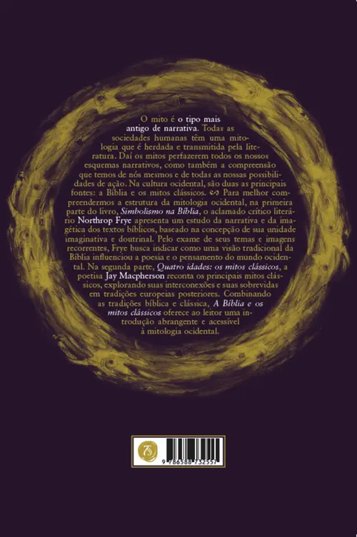 Para melhor compreendermos a estrutura da mitologia ocidental, na primeira parte do livro, Simbolismo na Bíblia, o aclamado crítico literário Northrop Frye apresenta um estudo da narrativa e da imagética dos textos bíblicos, baseado na concepção de sua unidade imaginativa e doutrinal. Pelo exame de seus temas e imagens recorrentes, Frye busca indicar como uma visão tradicional da Bíblia influenciou a poesia e o pensamento do mundo ocidental. Na segunda parte, Quatro idades: os mitos clássicos, a poetisa Jay Macpherson reconta os principais mitos clássicos, explorando suas interconexões e suas sobrevidas em tradições europeias posteriores. Combinando as tradições bíblica e clássica, A Bíblia e os mitos clássicos oferece ao leitor uma introdução abrangente e acessível à mitologia ocidental.