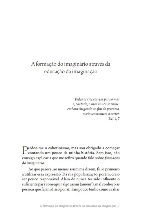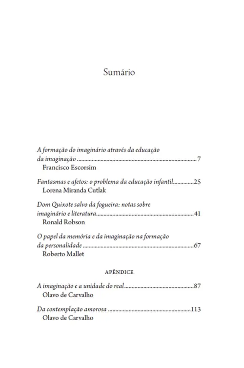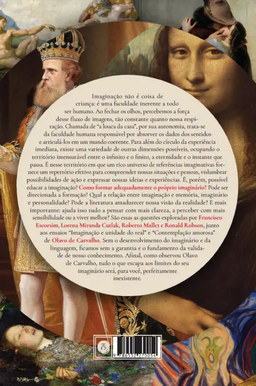 Imaginação não é coisa de criança: é uma faculdade inerente a todo ser humano. Ao fechar os olhos, percebemos a força desse fluxo de imagens, tão constante quanto nossa respiração. Chamada de “a louca da casa”, por sua autonomia, trata-se da faculdade humana responsável por absorver os dados dos sentidos e articulá-los em um mundo coerente. Para além do círculo da experiência imediata, existe uma variedade de outras dimensões possíveis, ocupando o território imensurável entre o infinito e o finito, a eternidade e o instante que passa. É nesse território em que um rico universo de referências imaginativas fornece um repertório efetivo para compreender nossas situações e pessoas, vislumbrar possibilidades de ação e expressar nossas ideias e experiências. É, porém, possível educar a imaginação? Como formar adequadamente o próprio imaginário? Pode ser direcionada a formação? Qual a relação entre imaginação e memória, imaginário e personalidade? Pode a literatura amadurecer nossa visão da realidade? E mais importante: ajuda isso tudo a pensar com mais clareza, a perceber com mais sensibilidade ou a viver melhor? São essas as questões exploradas por Francisco Escorsim, Lorena Miranda Cutlak, Roberto Mallet e Ronald Robson, junto aos ensaios “Imaginação e unidade do real” e “Contemplação amorosa” de Olavo de Carvalho. Sem o desenvolvimento do imaginário e da linguagem, ficamos sem a garantia e o fundamento da validade de nosso conhecimento. Afinal, como observou Olavo de Carvalho, tudo o que escapa aos limites do seu imaginário será, para você, perfeitamente inexistente.
