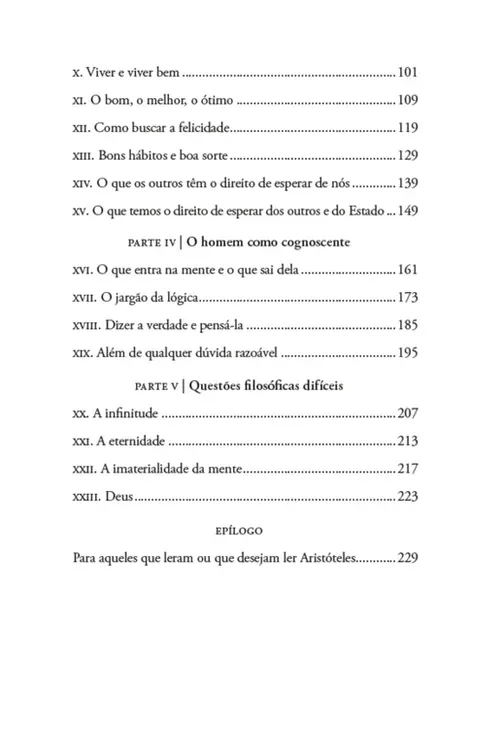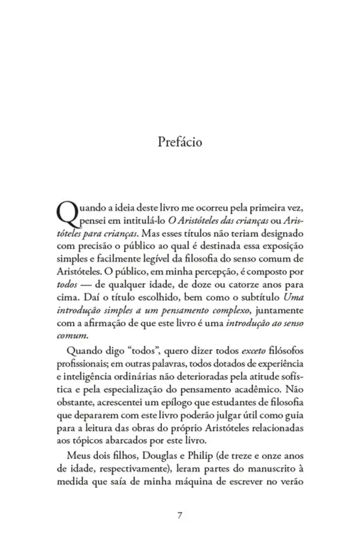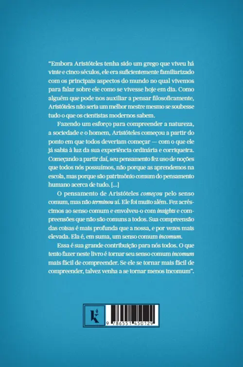 “Embora Aristóteles tenha sido um grego que viveu há vinte e cinco séculos, ele era suficientemente familiarizado com os principais aspectos do mundo no qual vivemos para falar sobre ele como se vivesse hoje em dia. Como alguém que pode nos auxiliar a pensar filosoficamente, Aristóteles não seria um melhor mestre mesmo se soubesse tudo o que os cientistas modernos sabem. Fazendo um esforço para compreender a natureza, a sociedade e o homem, Aristóteles começou a partir do ponto em que todos deveriam começar — com o que ele já sabia à luz da sua experiência ordinária e corriqueira. Começando a partir daí, seu pensamento fez uso de noções que todos nós possuímos, não porque as aprendemos na escola, mas porque são patrimônio comum do pensamento humano acerca de tudo. [...] O pensamento de Aristóteles começou pelo senso comum, mas não terminou aí. Ele foi muito além. Fez acréscimos ao senso comum e envolveu-o com insights e compreensões que não são comuns a todos. Sua compreensão das coisas é mais profunda que a nossa, e por vezes mais elevada. Ela é, em suma, um senso comum incomum. Essa é sua grande contribuição para nós todos. O que tento fazer neste livro é tornar seu senso comum incomum mais fácil de compreender. Se ele se tornar mais fácil de compreender, talvez venha a se tornar menos incomum”.