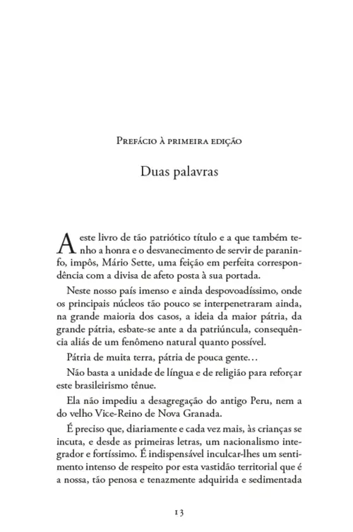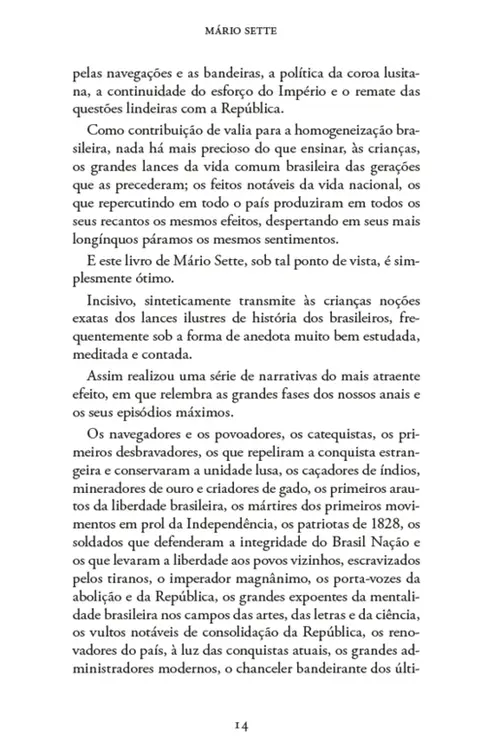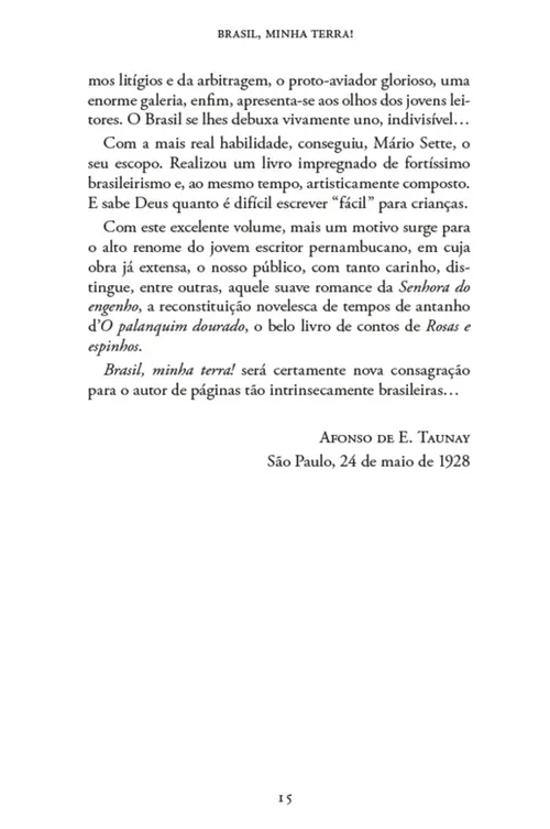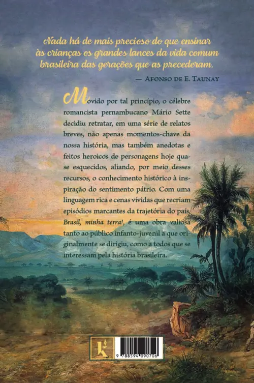 Movido por tal consciência, o célebre romancista pernambucano Mário Sette decidiu retratar, em uma série de relatos breves, não apenas momentos-chave da nossa história, mas também anedotas e feitos heroicos de personagens hoje quase esquecidos, aliando, por meio desses recursos, o conhecimento histórico à inspiração do sentimento pátrio. Com uma linguagem rica e cenas vívidas que recriam episódios marcantes da trajetória do país, Brasil, minha terra!, é uma obra valiosa tanto ao público infanto-juvenil a que originalmente se dirigiu, como a todos que se interessam pela história brasileira.