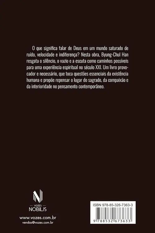 Nesta obra, Byung-Chul Han resgata o silêncio, o vazio e a escuta como caminhos possíveis para uma experiência espiritual no século XXI. Um livro provocador e necessário, que toca questões essenciais da existência humana e propõe repensar o lugar do sagrado, da compaixão e da interioridade no pensamento contemporâneo.