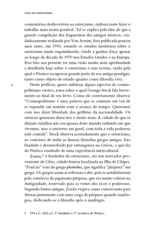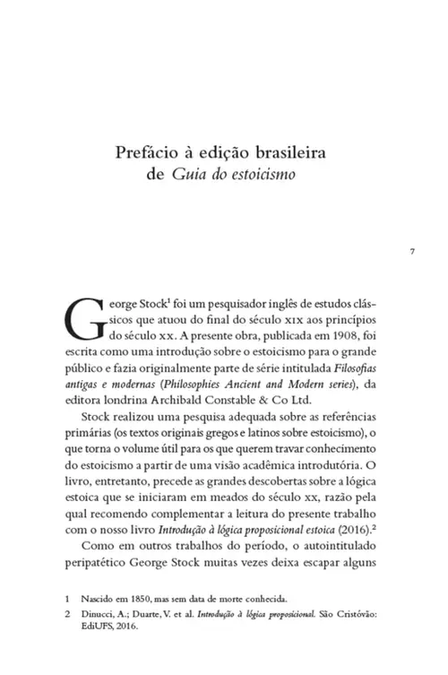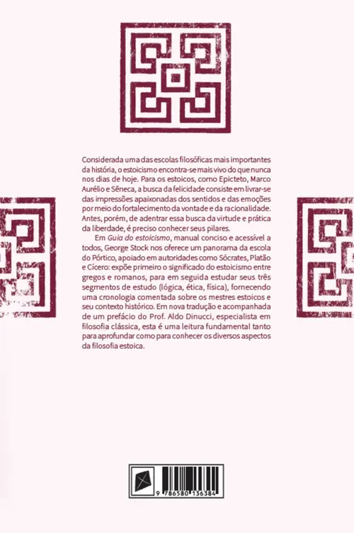 Em Guia do estoicismo, manual conciso e acessível a todos, George Stock nos oferece um panorama da escola do Pórtico, apoiado em autoridades como Sócrates, Platão e Cícero: expõe primeiro o significado do estoicismo entre gregos e romanos, para em seguida estudar seus três segmentos de estudo (lógica, ética, física), fornecendo uma cronologia comentada sobre os mestres estoicos e seu contexto histórico. Em nova tradução e acompanhada de um prefácio do Prof. Aldo Dinucci, especialista em filosofia clássica, esta é uma leitura fundamental tanto para aprofundar como para conhecer os diversos aspectos da filosofia estoica.