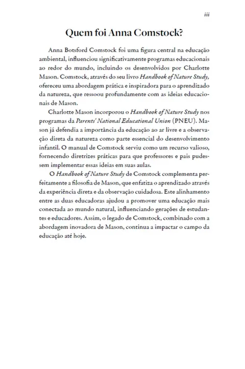 A coleção “Manual de Estudos da Natureza" de Anna Botsford Comstock convida você a explorar o fascinante mundo natural com uma nova perspectiva. A autora acredita que o primeiro passo para entender o mundo à nossa volta é conhecer os seres e elementos mais próximos, aqueles que habitam o nosso cotidiano. De maneira simples e envolvente, Comstock nos leva a um passeio por campos, jardins, céus e florestas, revelando os detalhes dos seres vivos mais comuns e dos elementos não vivos que compõem o nosso ambiente.