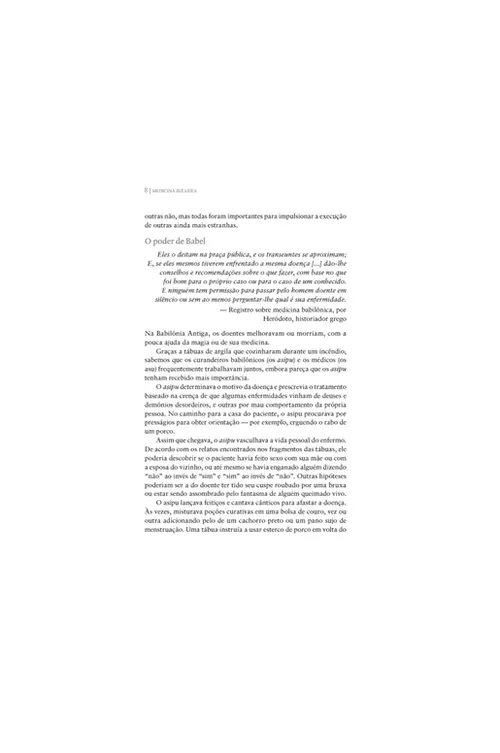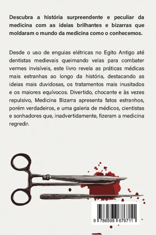 Desde o uso de enguias elétricas no Egito Antigo até dentistas medievais queimando velas para combater vermes invisíveis, este livro revela as práticas médicas mais estranhas ao longo da história, destacando as ideias mais duvidosas, os tratamentos mais inusitados e os maiores equívocos. Divertido, chocante e às vezes repulsivo, Medicina Bizarra apresenta fatos estranhos, porém verdadeiros, e uma galeria de médicos, cientistas e sonhadores que, inadvertidamente, fizeram a medicina regredir.