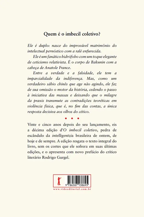Vinte e cinco anos depois do seu lançamento, eis a décima edição d’O imbecil coletivo, pedra de escândalo da intelligentzia brasileira de ontem, de hoje e de sempre. A edição resgata o texto integral do livro, sem os cortes que ele sofrera em suas últimas edições, e o apresenta com novo prefácio do crítico literário Rodrigo Gurgel.