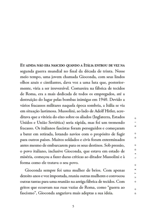 Gioconda nasceu às margens do rio Tibre em 1922, na Itália. Desde a sua infância, é atormentada por aparições e forças malignas, carregando o dom da destruição para todos à sua volta. No início da Segunda Guerra Mundial, com apenas 18 anos, toma a decisão de fugir do seu país para viver sem as assombrações do passado. Quais os segredos que ela esconde?