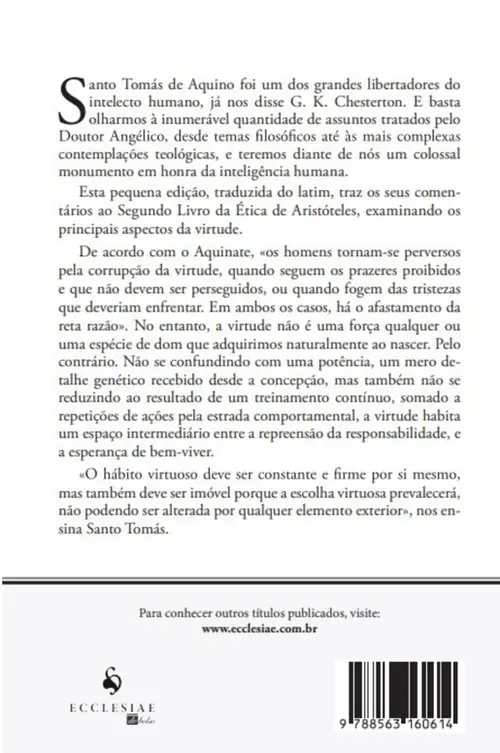<p>Santo Tomás de Aquino foi um dos grandes libertadores do intelecto humano, já nos disse G. K. Chesterton. E basta olharmos à inumerável quantidade de assuntos tratados pelo Doutor Angélico, desde temas filosóficos até às mais complexas contemplações teológicas, e teremos diante de nós um colossal monumento em honra da inteligência humana.</p> <p>Esta pequena edição, traduzida do latim, traz os seus comentários ao Segundo Livro da Ética de Aristóteles, examinando os principais aspectos da virtude.</p> <p>De acordo com o Aquinate, "os homens tornam-se perversos pela corrupção da virtude, quando seguem os prazeres proibidos e que não devem ser perseguidos, ou quando fogem das tristezas que deveriam enfrentar. Em ambos os casos, há o afastamento da reta razão". No entanto, a virtude não é uma força qualquer ou uma espécie de dom que adquirimos naturalmente ao nascer. Pelo contrário. Não se confundindo com uma potência, um mero detalhe genético recebido desde a concepção, mas também não se reduzindo ao resultado de um treinamento contínuo, somado a repetições de ações pela estrada comportamental, a virtude habita um espaço intermediário entre a repreensão da responsabilidade, e a esperança de bem-viver.</p> <p>"O hábito virtuoso deve ser constante e firme por si mesmo, mas também deve ser imóvel porque a escolha virtuosa prevalecerá, não podendo ser alterada por qualquer elemento exterior", nos ensina Santo Tomás.</p> <p><b>Ficha Técnica:</b><br /> Número de Páginas: 116<br /> Editora: Ecclesiae de Bolso<br /> Idioma: Português<br /> ISBN: 978-85-63160-61-4<br /> Dimensões do Livro: 12 x 17,5 cm</p>