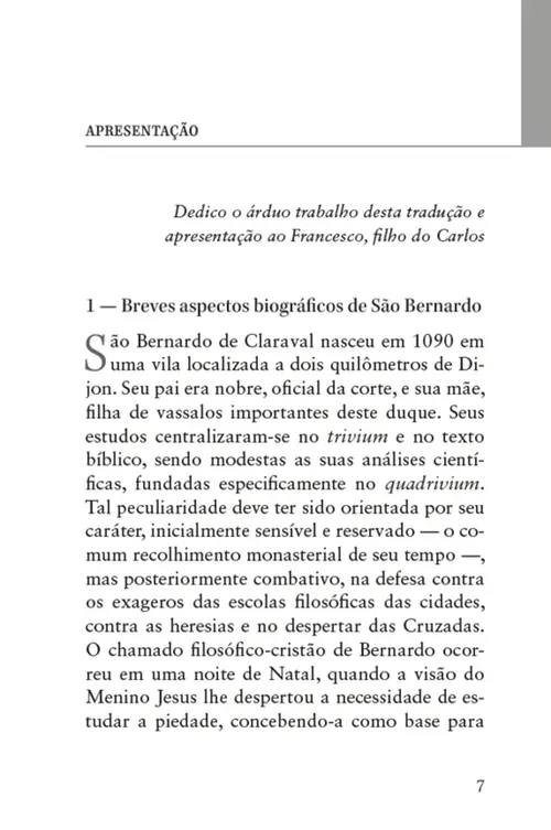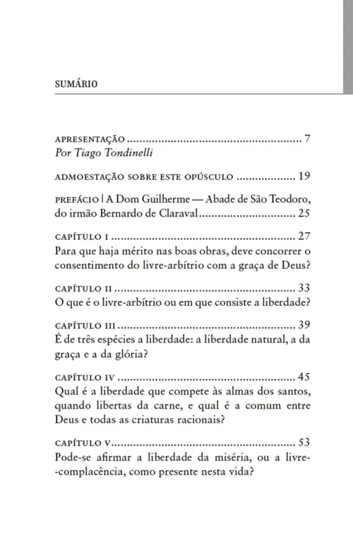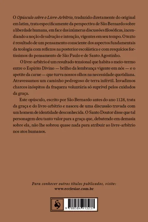 O Opúsculo sobre o Livre-Arbítrio, traduzido diretamente do original em latim, trata especificamente da perspectiva de São Bernardo sobre a liberdade humana, em face das inúmeras discussões filosóficas, incendiando a noção de salvação e intenção, vigentes em seu tempo. O texto é resultado de um pensamento consciente dos aspectos fundamentais