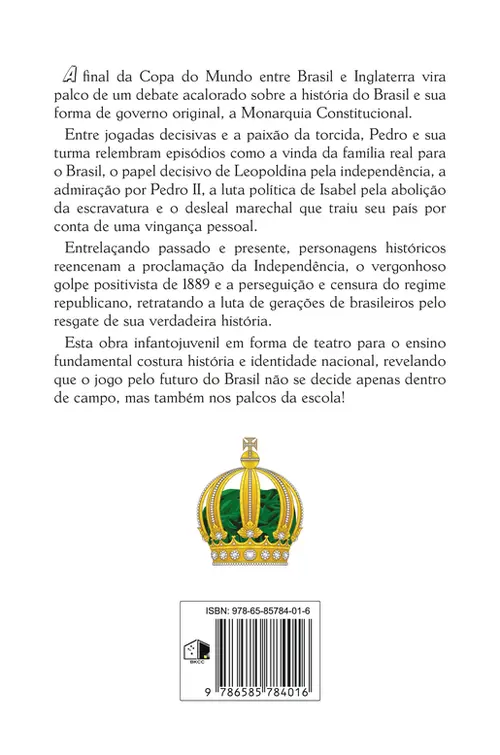 A final da Copa do Mundo entre Brasil e Inglaterra vira palco de um debate acalorado sobre a história do Brasil e sua forma de governo original, a Monarquia Constitucional. Entre jogadas decisivas e a paixão da torcida, Pedro e sua turma relembram episódios como a vinda da família real para o Brasil, o papel decisivo de Leopoldina pela independência, a admiração por Pedro II, a luta política de Isabel pela abolição da escravatura e o desleal marechal que traiu seu país por conta de uma vingança pessoal. Entrelaçando passado e presente, personagens históricos reencenam a proclamação da Independência, o vergonhoso golpe positivista de 1889 e a perseguição e censura do regime republicano, retratando a luta de gerações de brasileiros pelo resgate de sua verdadeira história. Esta obra infantojuvenil em forma de teatro para o ensino fundamental costura história e identidade nacional, revelando que o jogo pelo futuro do Brasil não se decide apenas dentro de campo, mas também nos palcos da escola!