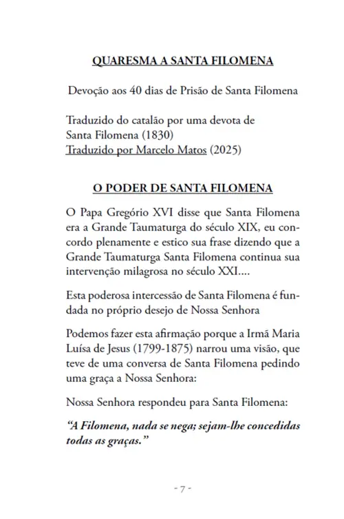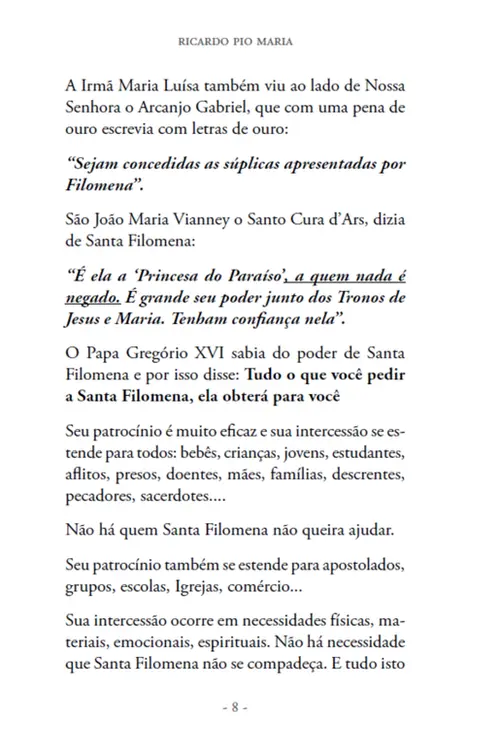 “Ide a Santa Filomena e ser-vos-à feito o que pretendeis, e agradecei a ela tudo o que receberdes”.