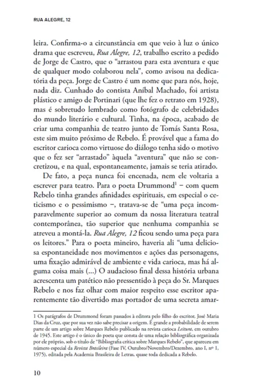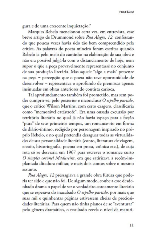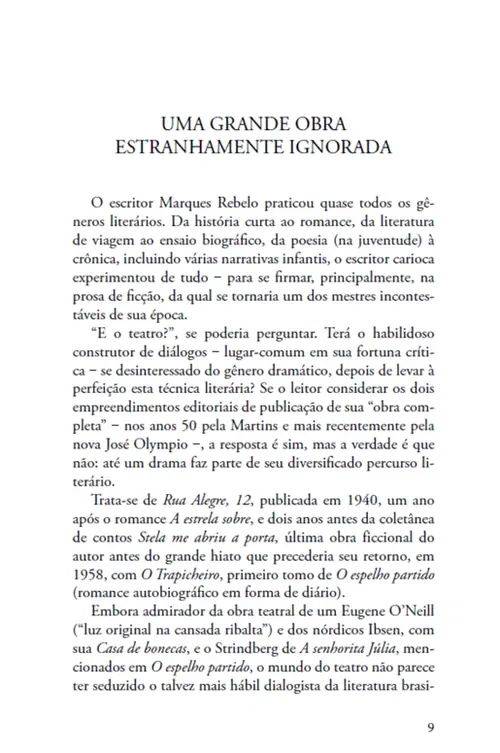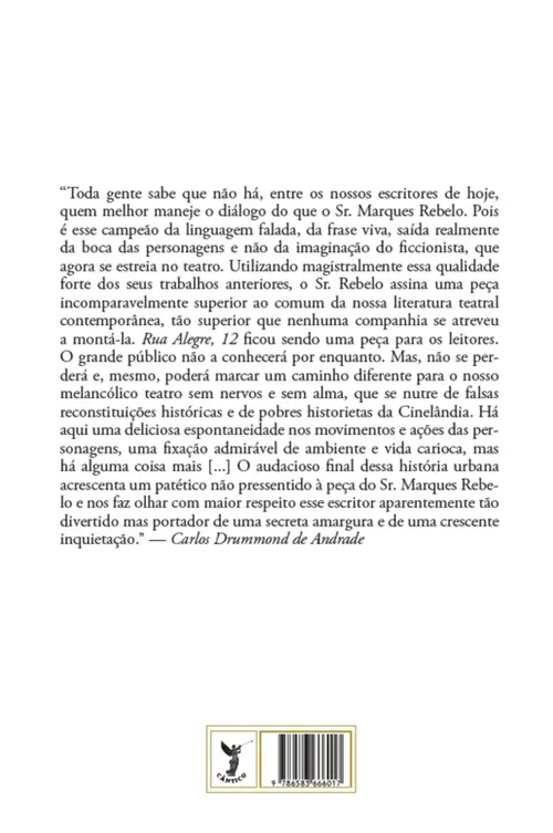 Rua Alegre, 12, publicada em 1940, é a única peça teatral publicada por Marques Rebelo. Para Carlos Drummond de Andrade, trata-se de “uma peça incomparavelmente superior ao comum da nossa literatura teatral contemporânea” mas, não tendo sido jamais encenada, “ficou sendo uma peça para os leitores.” Em Rua Alegre, 12 está o melhor que já se conhecia de Marques Rebelo, resultado de mais de uma década de trabalho literário cuidadoso, nada improvisado, para o qual terá contribuído a flaubertiana paciência da reescrita: diálogos perfeitos, pleno domínio do ritmo narrativo, conhecimento da alma humana. Para melhor explicitar a verdade das almas, concebeu aqueles dois planos em que se desenrola a ação dramática: o que dá conta das relações mais epidérmicas entre os personagens, e o outro, sob a cortina descida, que procura revelar a intimidade pessoal ou os conflitos que nunca afloram além da máscara imposta pelo meio. Rua Alegre, 12 é obra de plena maturidade, último trabalho de fôlego antes de o autor iniciar o longo período de hibernação que precedeu O espelho partido.