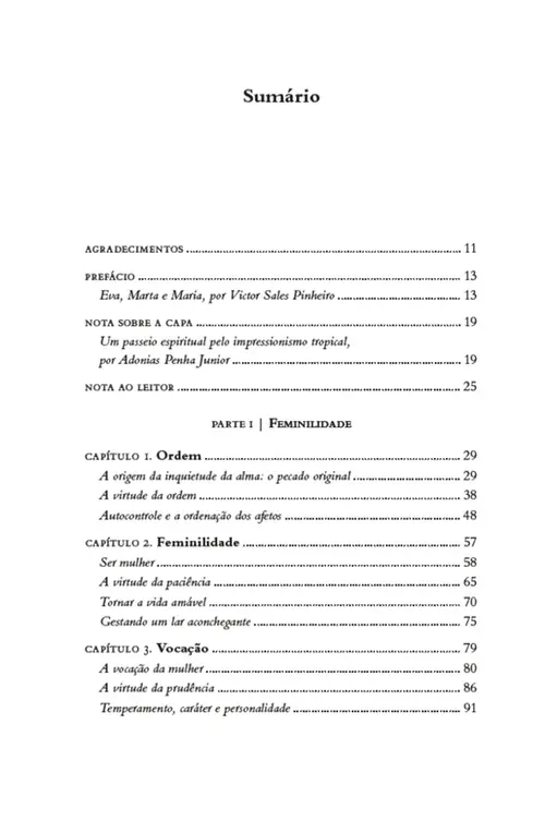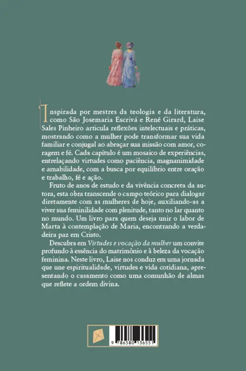 Fruto de anos de estudo e da vivência concreta da autora, esta obra transcende o campo teórico para dialogar diretamente com as mulheres de hoje, auxiliando-as a viver sua feminilidade com plenitude, tanto no lar quanto no mundo. Um livro para quem deseja unir o labor de Marta à contemplação de Maria, encontrando a verdadeira paz em Cristo. Descubra em Virtudes e vocação da mulher um convite profundo à essência do matrimônio e à beleza da vocação feminina. Neste livro, Laise nos conduz em uma jornada que une espiritualidade, virtudes e vida cotidiana, apresentando o casamento como uma comunhão de almas que reflete a ordem divina.